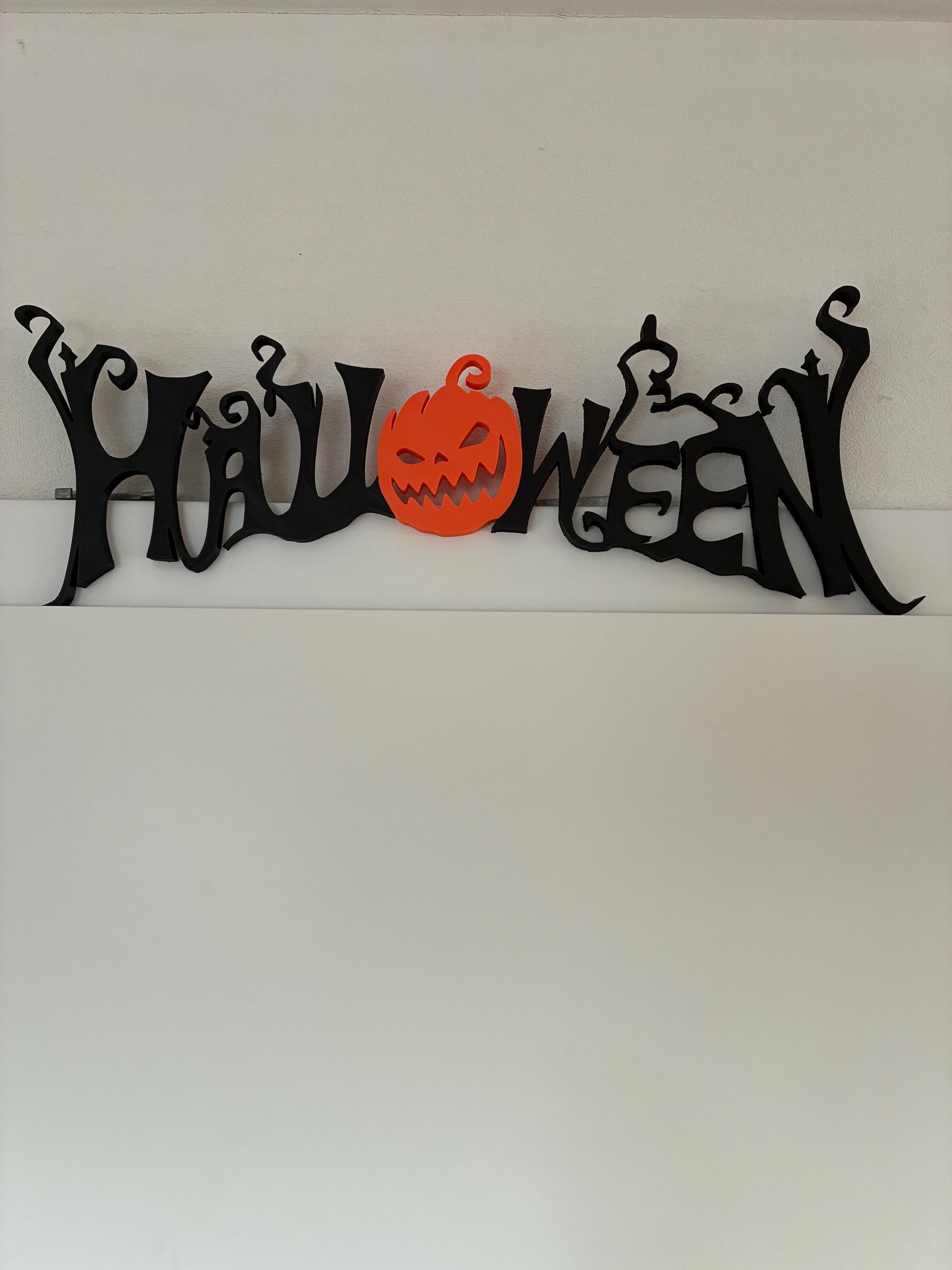 Bring a spooky, spooky atmosphere home with this unique 3D-printed Halloween sign! Its special feature: The "O" in the word "Halloween" is replaced by a grinning pumpkin with a grimace β a real eye-catcher for any shelf, windowsill, or Halloween party decoration.