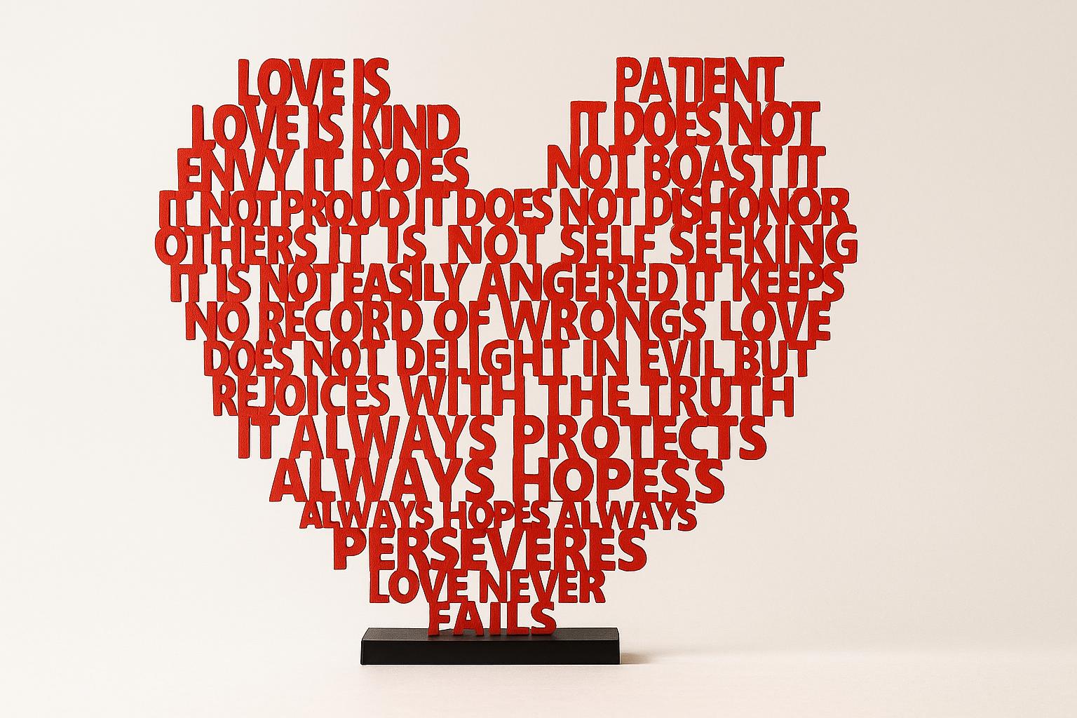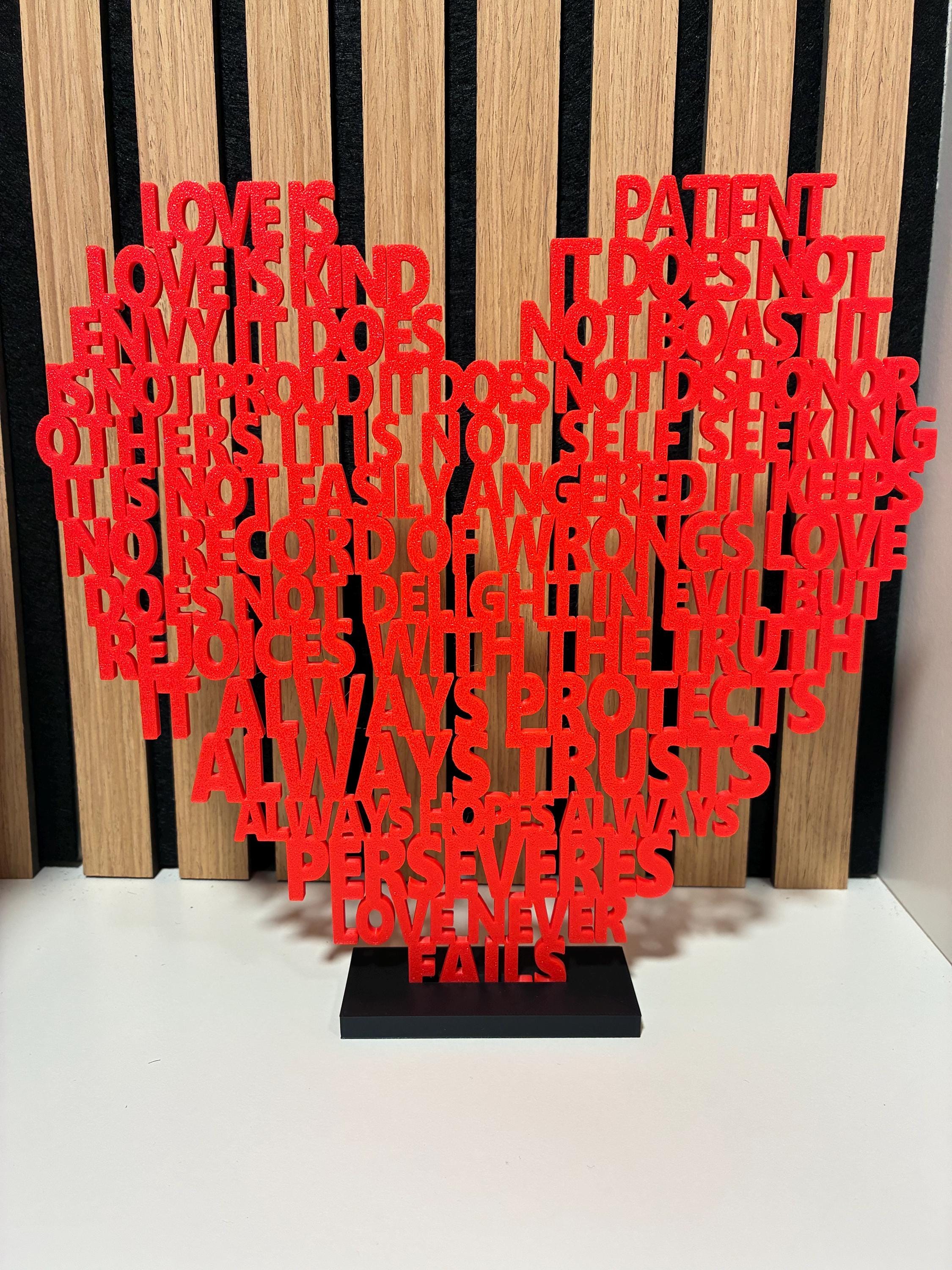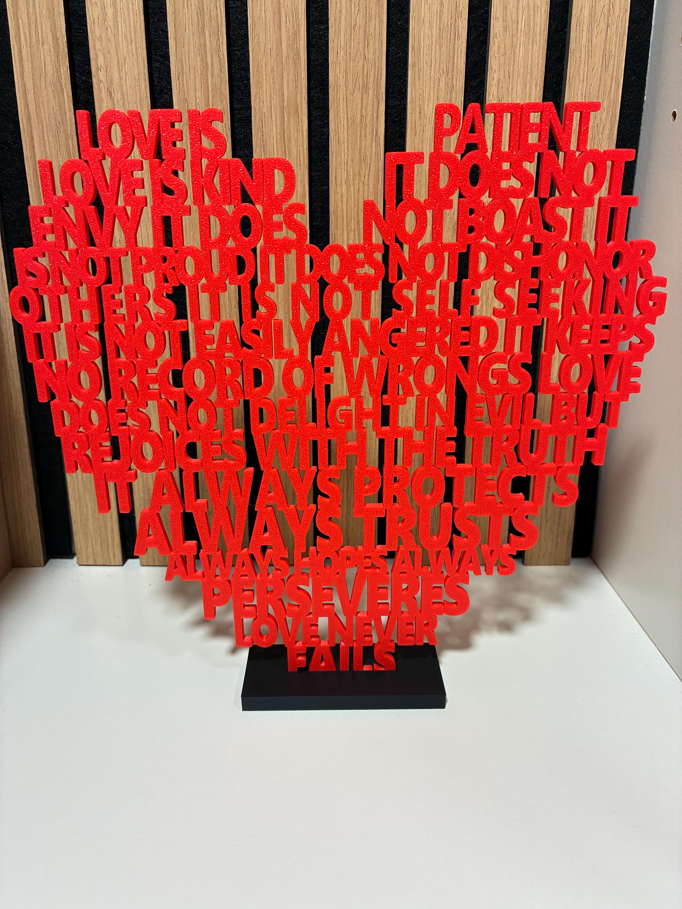 Bring love into your home with this unique 3D-printed heart made of text, inspired by the famous Bible verse 1 Corinthians 13:4–8 – “Love is patient, love is kind…”
