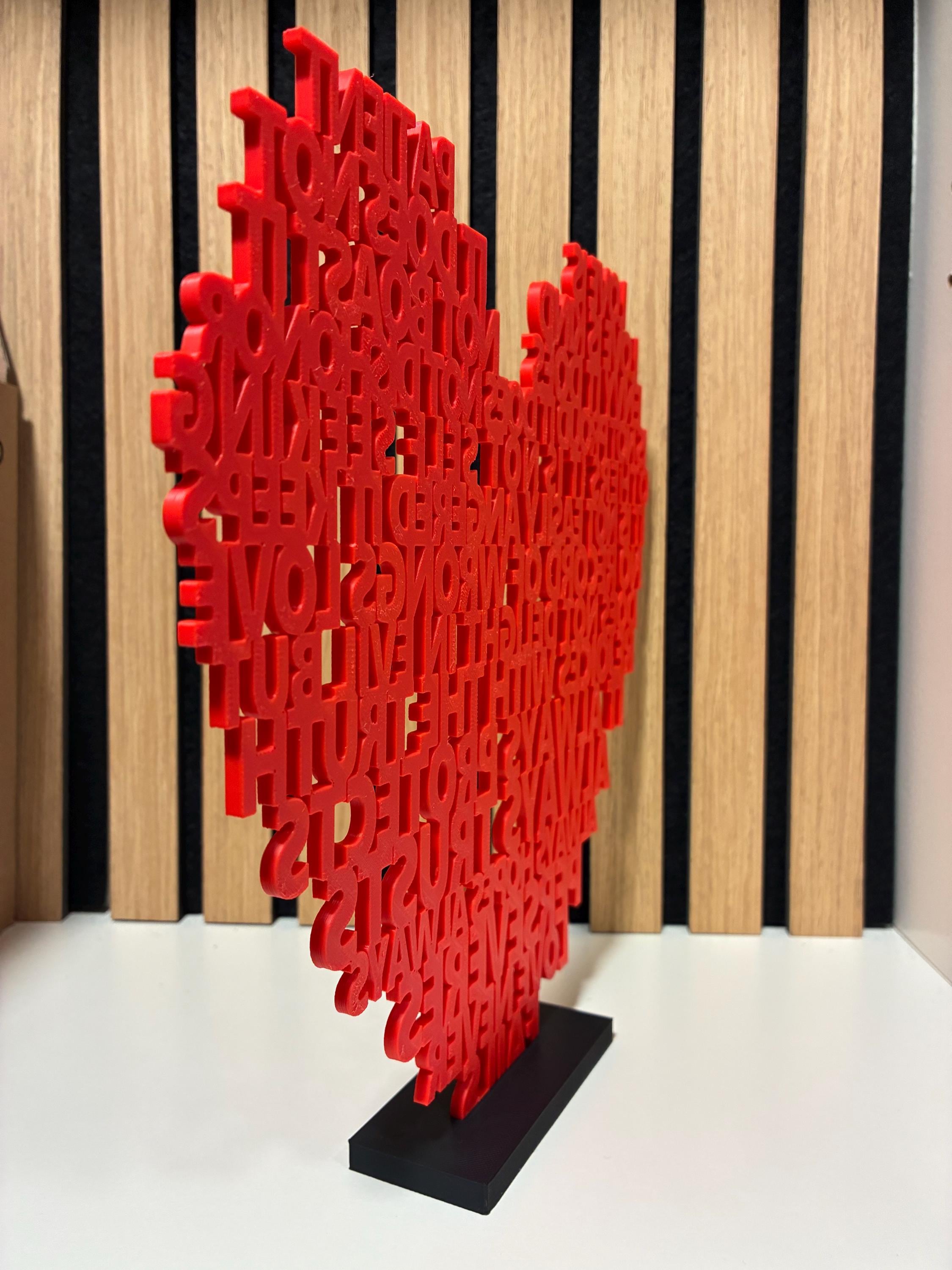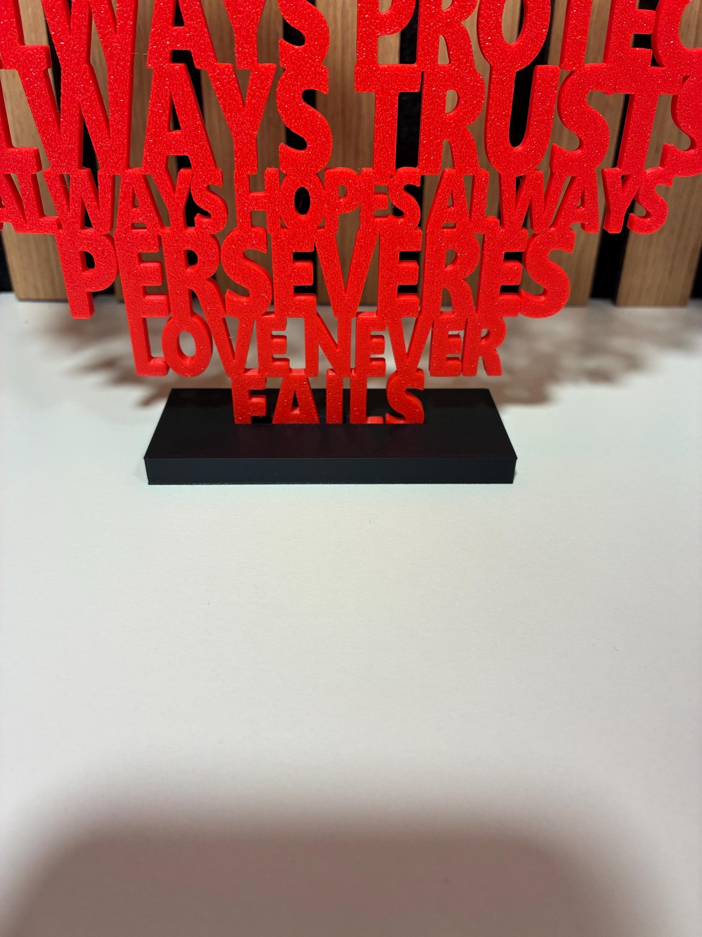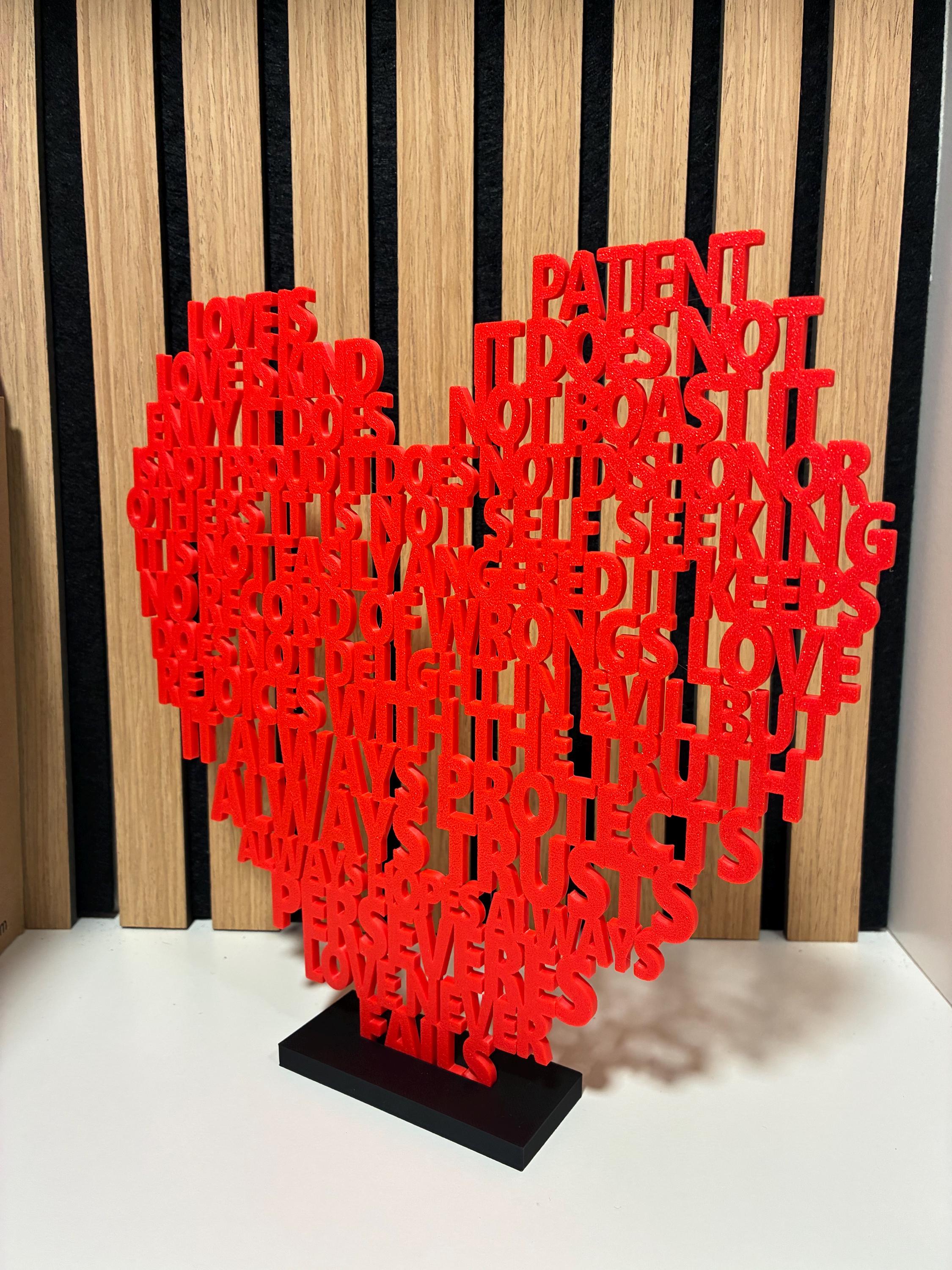 Bring love into your home with this unique 3D-printed heart made of text, inspired by the famous Bible verse 1 Corinthians 13:4–8 – “Love is patient, love is kind…”